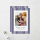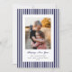 Um clássico cartão de férias plano com listras finas azuis navais e brancas, uma mensagem de 'Feliz Ano Novo' em uma fonte de caneta tinográfica tradicional com texto totalmente personalizável abaixo e uma foto. O suporte tem o mesmo padrão de listras, mas pode ser facilmente trocado por uma foto, se preferir. Disponível em diferentes cores e com diferentes mensagens de férias na minha loja.