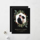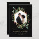 Este lindo cartão de Natal para recém-casados apresenta sua própria foto de casamento, rodeada por uma moldura geométrica dourada falsa com folhas douradas correspondentes, folhagens de Natal e frutos de azevinho vermelhos em um fundo preto moderno. O texto elegante diz "Casados e Alegres".