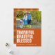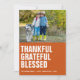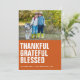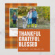 Cartão de foto de Ação de Graças rústico, moderno e fofo com uma foto no topo. Laranja queimado sólido com tipo branco negrito "agradecido, grato, abençoado" alinhado à esquerda. Personalize com seus nomes, o ano e uma saudação de feriado (mostrada com "Feliz Dia de Ação de Graças"), e adicione uma foto adicional e mensagem pessoal no verso, se desejar. Envie-me uma mensagem se precisar de ajuda ou tiver alguma solicitação especial.