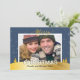 Celebre a magia da época com este cartão de foto familiar personalizável de “Feliz Natal” que apresenta um cenário de inverno maravilhoso e flocos de neve cintilantes. O cartão é adornado com elegantes detalhes em azul e dourado para adicionar um toque sofisticado aos seus cumprimentos de Natal. Substitua a foto de espaço reservado pela sua própria foto e adicione o nome da sua família para criar um cartão de Natal único e feito sob medida. A parte traseira do cartão apresenta neve caindo, uma simples saudação de “Feliz Natal” e texto adicional personalizável.
