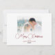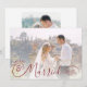 Cartão de Natal e/ou anúncio de casamento personalizado com fotos de recém-casados (uma de cada lado), título com tipografia de caligrafia moderna e elegante "MERRY & MARRIED" mostrado em vermelho editável na frente e sua escolha de saudação de Natal no verso na cor de texto de sua escolha. ASSISTÊNCIA: Para obter ajuda com modificação de design ou personalização, alteração de cor ou transferência do design para outro estilo de cartão ou produto, entre em contato com o designer ANTES DE COMPRAR por meio da guia de MENSAGEM do Zazzle Chat abaixo ou envie um e-mail para makeitaboutyoustore@gmail.com.