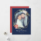 Este cartão de Natal elegante apresenta uma bela moldura geométrica dourada decorada com buquês florais festivos de Natal, tudo contra um belo fundo azul-marinho. Os buquês são compostos por rosas, poinsettias, pinhas, frutas vermelhas e ramos de pinheiro. Personalize com uma saudação de Natal personalizada, seus nomes e foto favorita. A parte de trás do cartão é de uma linda tonalidade de vermelho-caráctere, mas é personalizável para qualquer cor que você desejar!