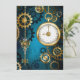 Turquesa, texturizada, fundo steampunk com latão e engrenagens douradas, chave prateada e relógio. Estilo Steampunk.