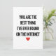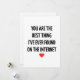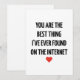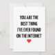 Send your love in the most modern and heartfelt way with this Valentine’s Day card featuring the quote “You're the best thing I've ever found on the internet.” Perfect for couples who met online, long-distance love, or anyone whose favorite person came from a screen and became real. This card is cute, funny, and romantic all at once—ideal for Valentine’s Day, anniversaries, or just because. Add your own personal message inside to make it extra special!