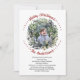 Este cartão de Natal apresenta uma coroa feita de verde ao redor de uma foto da família. As palavras "Feliz Natal" curvam graciosamente sobre a imagem, com o nome da família lindamente escrito abaixo num guião fluente, acentuado por pontos vermelhos. Uma mensagem sincera a tinta preta é colocada sob a foto, estendendo desejos calorosos ao receptor. No verso, um fundo vermelho profundo mostra um padrão diagonal da frase "Feliz Natal" em branco.
