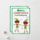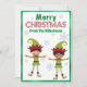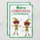 Este cartão de Natal personalizado com foto apresenta um tema festivo de Natal. Uma imagem de dois elfos meninos é mostrada dançando na parte inferior. Você pode substituir os rostos dos elfos pelas fotos personalizadas de seu filho. Um cumprimento de Boas Festas é impresso no topo com a palavra "Boas" impressa em um design de folha verde, e a palavra "Festas" impressa em um padrão de balão de folha listrada de caneca de Natal. Um nome de família de exemplo é impresso abaixo. Flocos de neve em estilo glitter azul acentuam o fundo. Um cumprimento de exemplo é impresso no verso em uma fonte verde caprichosa.