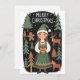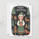 A warm festive illustration featuring a girl in a green traditional dress and hat, holding a wrapped gift. Surrounded by pine trees, a deer, a gingerbread figure, and twinkling lights.