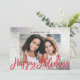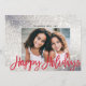 Este cartão com fotos de feriado moderno, mas elegante, apresenta uma foto horizontal solteiro sobre um maravilhoso fundo de imagem reluzente, e uma saudação em vermelho que diz "Felizes Feriados". Este design acomoda uma foto horizontal solteiro na frente. A parte traseira da placa é a mesma imagem de brilho, mas pode ser removida se desejar. Você também pode adicionar outra foto à parte traseira e/ou texto adicional.