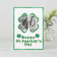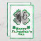 Este cartão de saudação personalizado do Dia de São Patrício apresenta uma moldura de foto de trevo da sorte. A moldura apresenta um design de glitter dourado e folha verde. Uma foto de amostra é colocada dentro, que você pode personalizar para incluir sua própria foto personalizada ou outra imagem. A saudação Feliz Dia de São Patrício é impressa em uma fonte borbulhante de folha verde e glitter dourado correspondente. Dois trevos são colocados em ambos os lados.