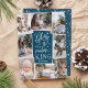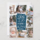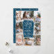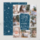 Um belo cartão com fotos de feriado religioso baseado em tipografia mostra oito das suas fotos familiares favoritas organizadas em um layout de colagem. "Glory to the newborn king" (Glória ao rei recém-nascido) aparece no centro em tipografia branca, escrita à mão sobre fundo azul-escuro, pontilhada com estrelas festivas. Personalize com seu nome de família embaixo.