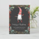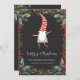 Um cartão de saudação bicolor com uma gnomo bonitinho em um chapéu vermelho e branco listrado, emoldurado por ramos de bagas sagradas. Vermelho, branco e preto.