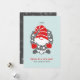 Um simpático gnomo da tradição folclórica nórdica adorna este cartão festivo e de feriado em tons de vermelho e cinza contra um fundo azul claro.