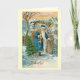 Delightful Swedish Christmas card showing Santa Claus arriving at a garden gate with a big sack of gifts and toys.