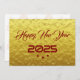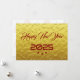 Greeting wish card Happy New Year written in English in red font with 3 stars on a golden background - editable text and background