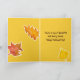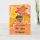 Um cartão de Ação de Graças Feliz personalizado para alguém especial com um personagem de bolota feliz com folhas coloridas ilustradas com aquarela em um fundo de lavagem a cor laranja quente. No dentro está uma cor ouro amarela e mais folhas. Você pode editar o texto para ajustado das suas necessidades. Cartão divertido para um neto!