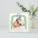 Grandmillenial Costeiro Cartão de Férias de Foto Limão Azul Chinoiserie Um Cartão de Férias Este lindo cartão de férias apresenta uma moldura de folhagem em aquarela para uma foto. A moldura é feita de fita azul de aquarela com ornamentos de Natal em estilo chinoiserie e folhagem ao redor da moldura com laço de Natal. A parte de trás do cartão apresenta folhagem com árvores de Natal e guirlanda.