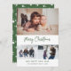 Custom green Merry Christmas photo cards featuring three photos with a hand-lettered title on the front and green background with falling snow and stars at the back. Easily personalize these green script Christmas photo cards with your images, a family name and the year.