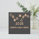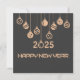 Square wish card Happy New Year written in English in gold font with Christmas balls on a grey background - editable text and background