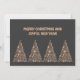 Greeting wish card Merry Christmas and Happy New Year written in English in gold font with Christmas trees with balls and stars on a grey background - editable text and background