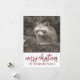 Guaxinim na neve de inverno, cartão de natal de férias. Adicione o nome da sua família. Estilo de bosques selvagens.