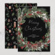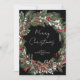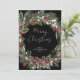 Espalhe alegria natalina com estilo este ano com este cartão de Natal com uma coroa botânica de frutas vermelhas. Mostre aos seus amigos e familiares que você se importa com um cartão de Natal elegante e moderno que certamente alegrará o dia de qualquer pessoa. Com uma coroa festiva em aquarela de folhagem de pinheiro, eucalipto, frutas vermelhas e brancas e pinhas, este cartão cria um design lindo sobre um fundo preto rico. A escrita à mão casual diz “Feliz Natal” e pode ser personalizada com sua própria mensagem de “Boas Festas”, “Feliz Hanukkah” ou qualquer coisa intermediária. A parte de trás do cartão apresenta um padrão botânico em preto para um visual ainda mais festivo e detalhado. Perfeito para famílias jovens e modernas, este cartão de Natal causará uma impressão memorável durante a temporada de festas. Envie aos seus entes queridos um pouco de alegria com este cartão de Natal com coroa botânica de frutas vermelhas! Copyright Elegant Inv