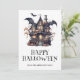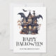 Belo cartão de Dia das Bruxas com uma bela casa assombrada, abóboras e morcegos. Personalize facilmente este cartão de Halloween com seu nome de família e texto.