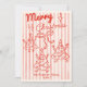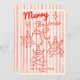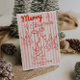 If you are looking for a unique elegant and easy editable non photo Christmas card. This one is perfect for you. And as you see, the design features a red hand made and drawn three funny fun Christmas trees and bow, With whimsical red hand written typography of MERRY CHRISTMAS. All on light watercolor red stripes. And your family name and year at the bottom. And In the back you got a a customizable Christmas greeting paragraph and a bow.