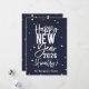 Happy New Year 2023 (Finally), new year humor holiday card. Features modern chic white typography on navy blue backgrounds with scattered golden confetti on front and back.