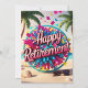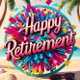 A vibrant beach scene unfolds, showcasing a colorful retirement celebration. The camera performs a sweeping aerial shot, capturing the festive atmosphere with confetti swirling in the air. The focal point is a large, cheerful 'Happy Retirement' sign, surrounded by tropical palm trees and seashells scattered on the sandy beach. As the camera glides closer, it reveals a pair of stylish sunglasses resting on the sand, enhancing the relaxed vibe. The lighting is bright and cheerful, evoking a sense of joy and freedom, with a warm color palette that complements the beach setting.