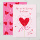 Cute Valentine's day flat greeting card with red heart lollipop and pink bow illustration. Bright lollipops pattern. Modern script lettering "You're the sweetest valentine", "XOXO". Pink and red colors. You can customize card with your text.
