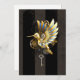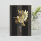 Steampunk, antigo, ouro, beija-flor mecânica com engrenagens de latão e chave prateada em fundo castanho listrado. Pássaro Dourado.