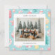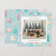 Cartão de férias com ilustrações temáticas de Natal fofas em uma paleta de cores pastéis, acompanhado de uma foto de família, uma mensagem de Natal e seu nome e ano em uma fonte sem serifa.