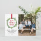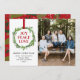 Este cartão com fotos de feriado apresenta uma ilustração tradicional da coroa de feriado em tons bonito de verde em um fundo branco. O verso do cartão de Natal tem um padrão festivo de folhas de abeto em fundo vermelho. Parte da coleção de cartões de Natal Wreath Joy Peace Love. Convites de festas, etiquetas de vinho, adesivos e outros objetos disponíveis. Crédito da foto: PhotoFloFlotal Studio.