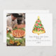 Ilustração da fatia de pizza em forma de árvore de Natal tocada com estrelas. Personalize o nome, o ano e a foto.