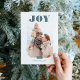 cartões com fotos de feriado personalizados com barato simples para personalização. Este design moderno chic tem uma borda abstrato com uma imagem vertical com texto JOY em uma fonte ousada serif. Personalize-o com o seu nome de família e o ano. O verso tem um impressão botânico moderno ou usa o espaço para fotos e textos adicionais. Use as ferramentas de design para editar o texto, adicionar mais fotos e criar um design de Cartões de foto de Natal.