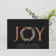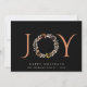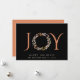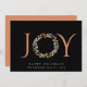 Um cartão de saudação de Natal minimamente moderno e inspirado no véu, que inclui a palavra "JOY" numa tipografia elegante de terracotta com o "O" representado por uma coroa aquática, tudo contra um fundo negro. Você pode personalizar a saudação de "Feriados Felizes" e seu nome e o ano.