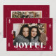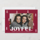 Compartilhe alegria de férias com este cartão festivo de Natal mostrando sua foto horizontal emoldurada por pinheiros brancos desenhados à mão em um rico fundo de burgundy. "Joyful" aparece em letras brancas em negrito, com espaço abaixo para sua saudação personalizada e nome da família. O verso inclui espaço para uma foto adicional, colocada contra um fundo burgando correspondente com sutis pontos brancos para um acabamento coeso e elegante.