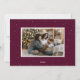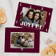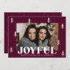 Cartão de Natal de fotografia festiva com a sua fotografia horizontal rodeada por pinheiros brancos desenhados à mão, com um fundo púrpura de merlot. "Joyful" é exibido em letras brancas em negrito com sua saudação personalizada e seu nome de família mostrado abaixo. A alegre carta de Natal reverte para exibir uma foto adicional e um fundo roxo escuro com sutis pontos brancos.