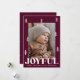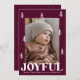 O Cartão de Férias do Vinho das Árvores Alegres 2 apresenta sua foto vertical moldada por elegantes pinheiros desenhados à mão, colocados contra um fundo de vinho rico. A inscrição "Joyful" branca-escura destaca o seu cartões de natal personalizado e o nome da família abaixo. O reverso do cartão mostra uma foto adicional sobre um fundo de vinho correspondente, destacada com sutis pontos brancos, fazer este cartão de Natal personalizado como uma forma na moda e memorável de compartilhar desejos de feriado quentes.