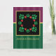 Pretty holiday card features a festive wreath composed of pet foot prints in green separated by bright, shiny red holly berries on a black background. Yellow gold frame around wreath separates the wreath design from the striped background with vertical stripes. Perfect for the pet lover.