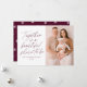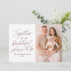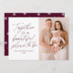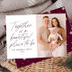 Cartão de Natal com fotografia moderno, com a frase "Juntos é um lugar bonito para ser", apresentado num roteiro manuscrito em merlot com um fundo branco. Personalize o cartão de feriado simples com seu nome de família, ano e foto vertical. A carta se inverte para um merlot e padrão branco de floco de neve.