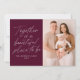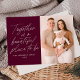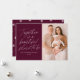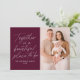 Cartão de Natal com fotografia moderno, com a frase "Juntos é um lugar bonito para ser", apresentado num guião manuscrito branco com um fundo de cor merlot. Personalize o cartão de feriado simples com seu nome de família, ano e foto vertical. A carta se inverte para um merlot e padrão branco de floco de neve.