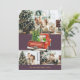 Cartão de Natal de foto roxo personalizado com uma colagem fotográfica e um caminhão vermelho vintage com árvores de Natal e um labrador na frente e um fundo roxo com ouro caindo neve no fundo. Personalize facilmente estes cartões de Natal elegantes e roxos com as suas imagens, um nome de família e o ano. Mais opções de cores disponíveis ou personalizar facilmente para qualquer cor por si próprio.