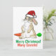 Uma lebre engraçada com o chapéu do Papai Noel deseja Boas Festas! Feliz Natal, Muita Cenoura! Um cartão de Natal personalizável para qualquer pessoa. Um modelo de texto no verso do cartão para a sua mensagem. Pode personalizar 3 linhas de texto de forma independente. Use o botão "Personalizar" para mudar a fonte, cor ou posição. Personalize e compre!