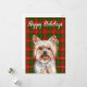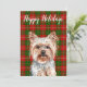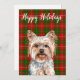 Cartão de Férias com ilustração em aquarela de cão Yorkshire Terrier em fundo xadrez verde e vermelho festivo e saudação de Férias personalizável.