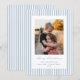 Um clássico cartão de feriado plano com listras azuis claras e brancas, uma mensagem de 'Feliz Natal' em uma fonte de caneta tinteira tradicional com texto totalmente personalizável abaixo e uma foto. O verso tem o mesmo padrão de listras, mas pode ser facilmente trocado por uma foto, se preferir. Disponível em diferentes cores e com diferentes mensagens de feriado na minha loja.