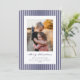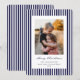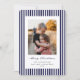 Um clássico cartão de Natal plano com listras finas azuis marinho e brancas, uma mensagem de 'Feliz Natal' em uma fonte de caneta tinta tradicional com texto totalmente personalizável abaixo e uma foto. A parte de trás tem o mesmo padrão de listras, mas pode ser facilmente trocado por uma foto, se preferir. Disponível em diferentes cores e com diferentes mensagens de Natal na minha loja.