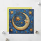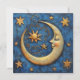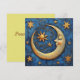 Um cartão de férias celestial bonito. A frente é uma lua de conteúdo e estrelas com um fundo azul bonito. As costas dizem: Paz na Terra. Esta é uma placa plana de dois lados.