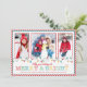 Cartão de Natal popular e moderno para três fotos da família, apresentando uma sequência de luzes de Natal com a frase "Que seus feriados sejam alegres e brilhantes" em um fundo de listras brancas e vermelhas com uma borda vermelha e azul-turquesa. O verso do nosso cartão de Natal exclusivo com foto apresenta um fundo de listras vermelhas e brancas. Cartão de Natal com luzes de árvore de Natal para mostrar sua bela família que seus filhos vão adorar!