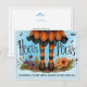 Um cartão encantador de Halloween com um traje de bruxa caprichoso, meias listradas e a frase divertida “Hocus Pocus, Encontrar sua Nova Casa é meu Foco!”. Perfeito para agentes imobiliários que desejam adicionar um toque festivo às visitas de outono ou presentes de agradecimento aos clientes. Os tons quentes de laranja e preto, os acentos florais e a mensagem alegre criam uma peça de marketing sazonal memorável. O verso pode ser personalizado com seu logotipo, código QR e informações de contato.